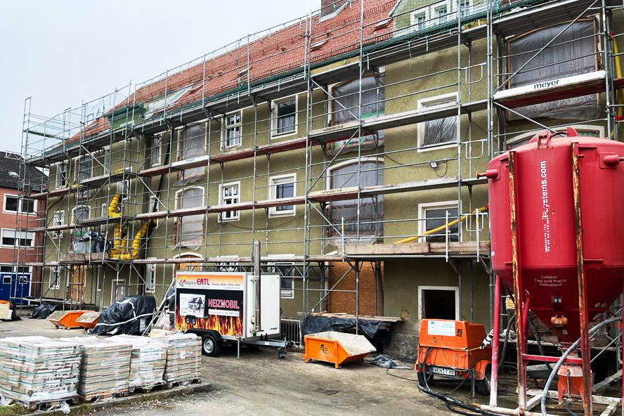 Kurz vor Weihnachten wurden wir beauftragt, die Heizungs-, Lüftungs- und Sanitärinstallation bei einem BV in der Schweigerstraße in Weiden durchzuführen. Die sechs denkmalgeschützten Mehrfamilienhäuser mit insgesamt 33 Wohneinheiten werden saniert. Damit die kalte Jahreszeit die Baumaßnahmen nicht unnötig behindert, wurde unsererseits die Winterbaubeheizung mit mobiler Heizzentrale und neun Lufterhitzern aufgebaut.