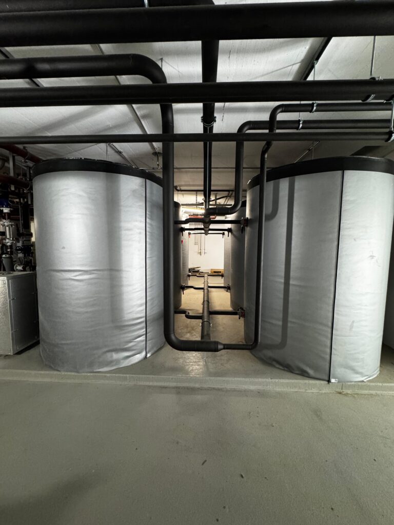 Die speziell angefertigten Pufferspeicher wurden bereits in das Gebäude eingebracht und verrohrt.
