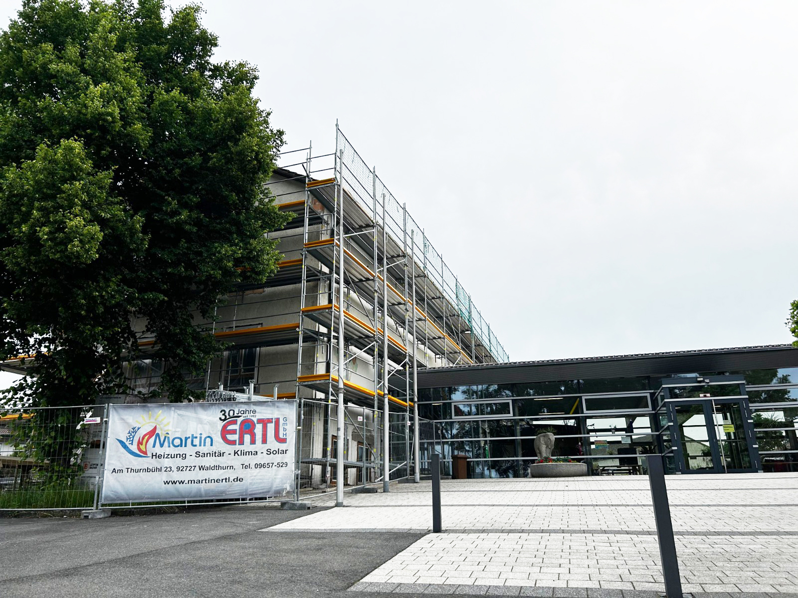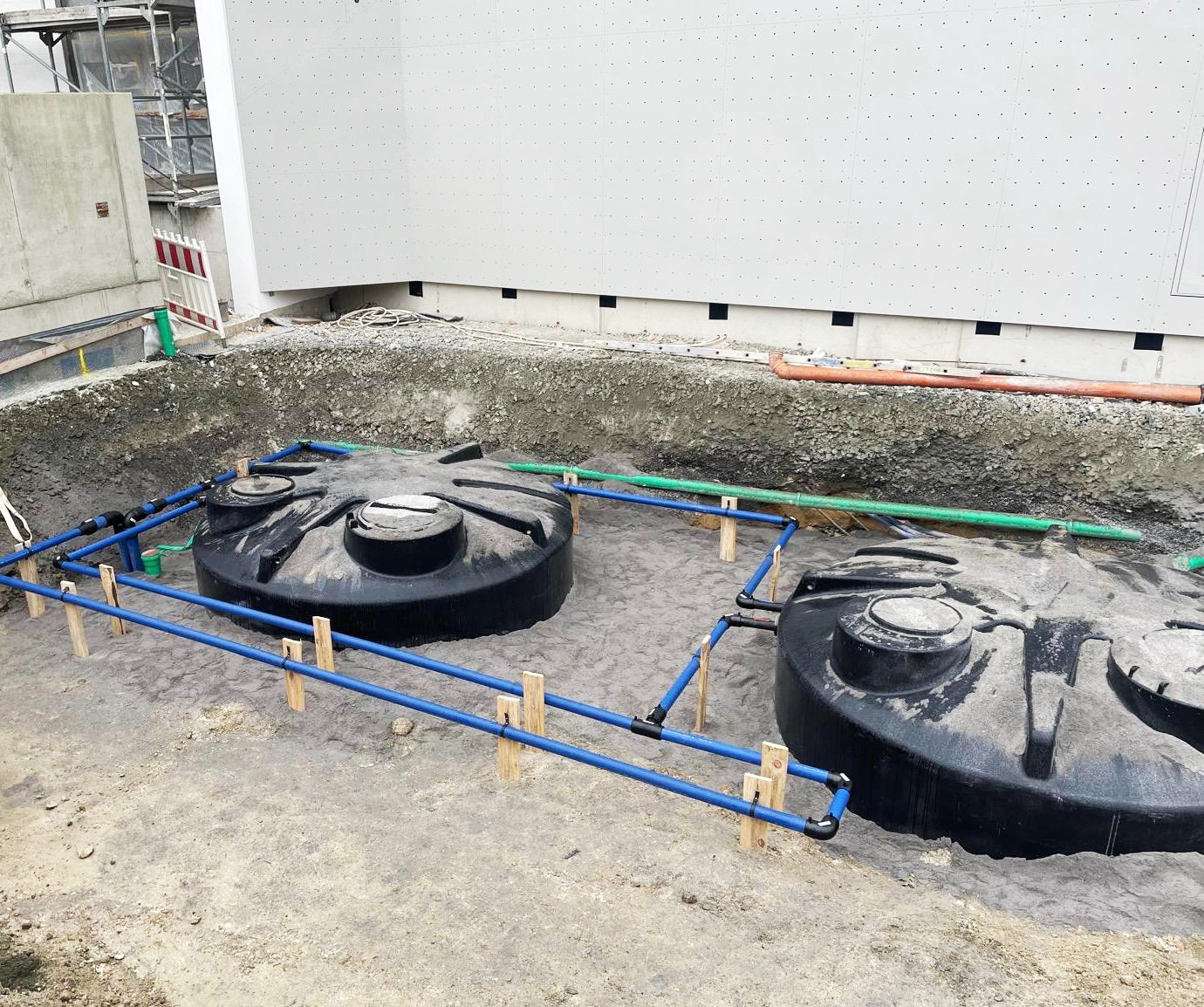UPDATE von der spannenden Baustelle in Tirschenreuth. Wie wir schon vor ein paar Wochen berichtet haben, sind wir für die Eisspeicherheizung der Kletterhalle beauftragt. Nun wurden die beiden Eis-Energiespeicher auf der Baustelle angeliefert – Durchmesser (je Speicher) 3 Meter, Höhe 3,26 m. Eine Herausforderung, für uns aber kein Problem. Beide Speicher wurden in den Boden eingebracht, angeschlossen und anschließend wieder mit Erdreich aufgefüllt.