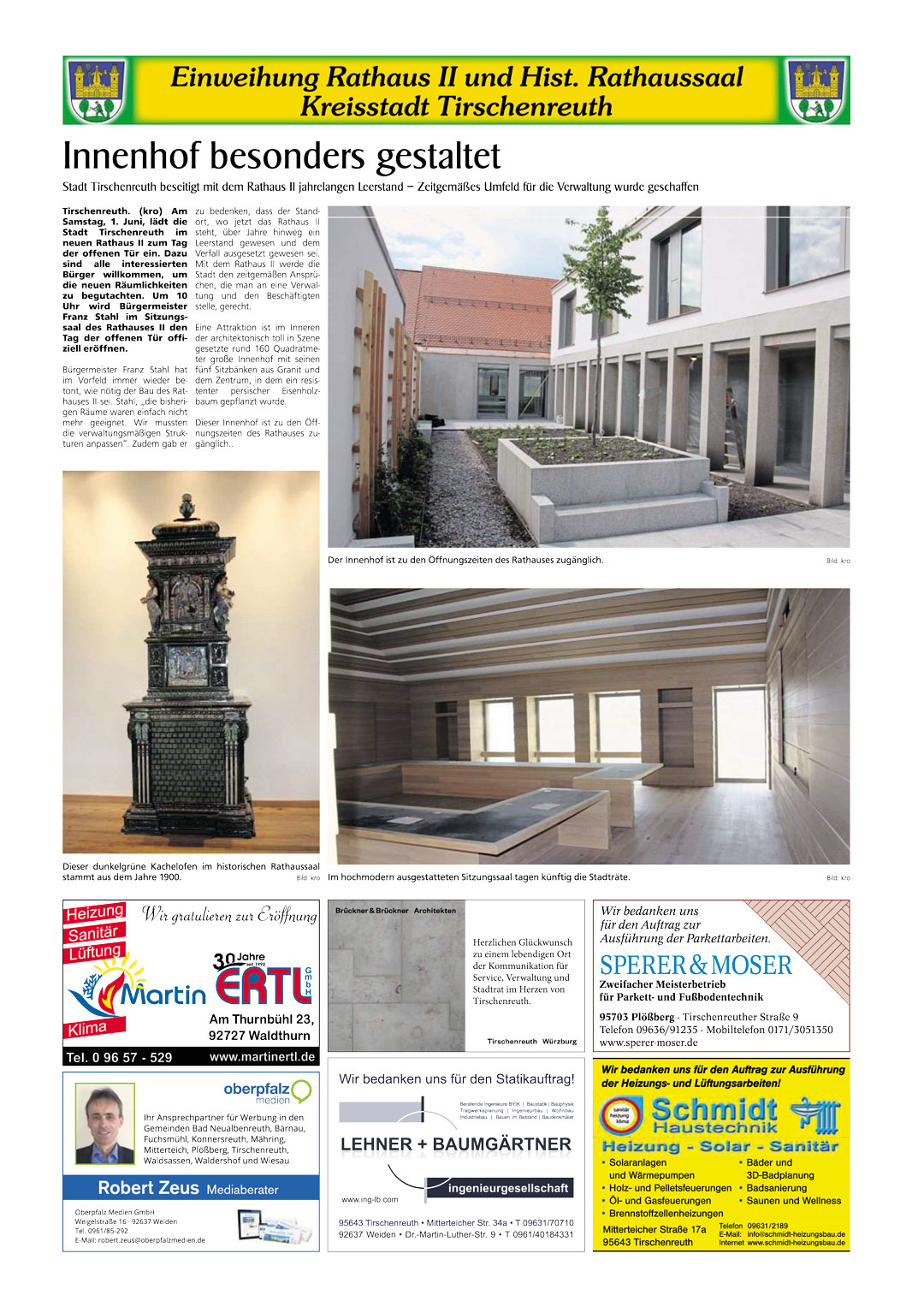 Am Samstag, den 01.06.2024 fand ein Tag der offenen Tür im neuen Rathaus II in Tirschenreuth statt. Neben dem hochmodernen Sitzungssaal ist der 160 Quadratmeter große Innenhof mit Granitsitzbänken eine tolle Attraktion geworden. Wir gratulieren ganz herzlich zur Eröffnung und zur gelungenen Umsetzung des Projektes.